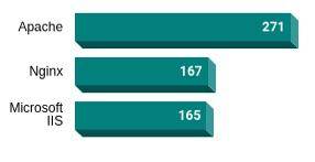 《财富》千强中最流行的 Web 服务器名单完全不出所料。前三名分别是 Apache、Nginx 和微软 IIS。由于 CDN 提供商隐藏了 Web 服务器,因此这些 Web 服务器的实际数量可能会更多。许多 CDN 提供商不提供 Server: HTTP 标头,因此这些站点的结果中没有数据。