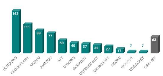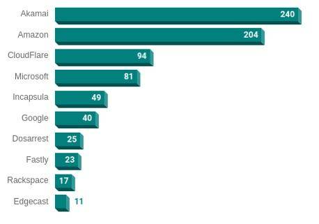 在著名的 CDN 服务中,我们看到亚马逊和微软在 Web 前端中占有重要地位。这些数据点既包括直接托管在云网络中的服务器,又包括亚马逊(CloudFront)和微软 Azure(CDN)提供的内容交付前端服务。