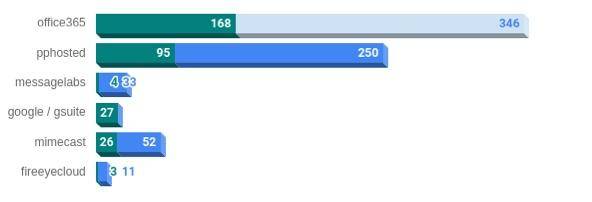 在上图中我们分离了结果。我们在 蓝色 表示的网关提供商中发现,客户端在电子邮件网关后面 使用 Office 365。这样 使用 Office 365 的公司数量达到了 514。由于公司可能对标准的 $company.onmicrosoft.com 做了更改,因此实际数量可能更高。