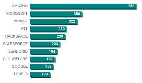 下图显示了在《财富》千强中 ASN 的出现次数。数据通过将发现的子域解析为 IP->ASN 得出。