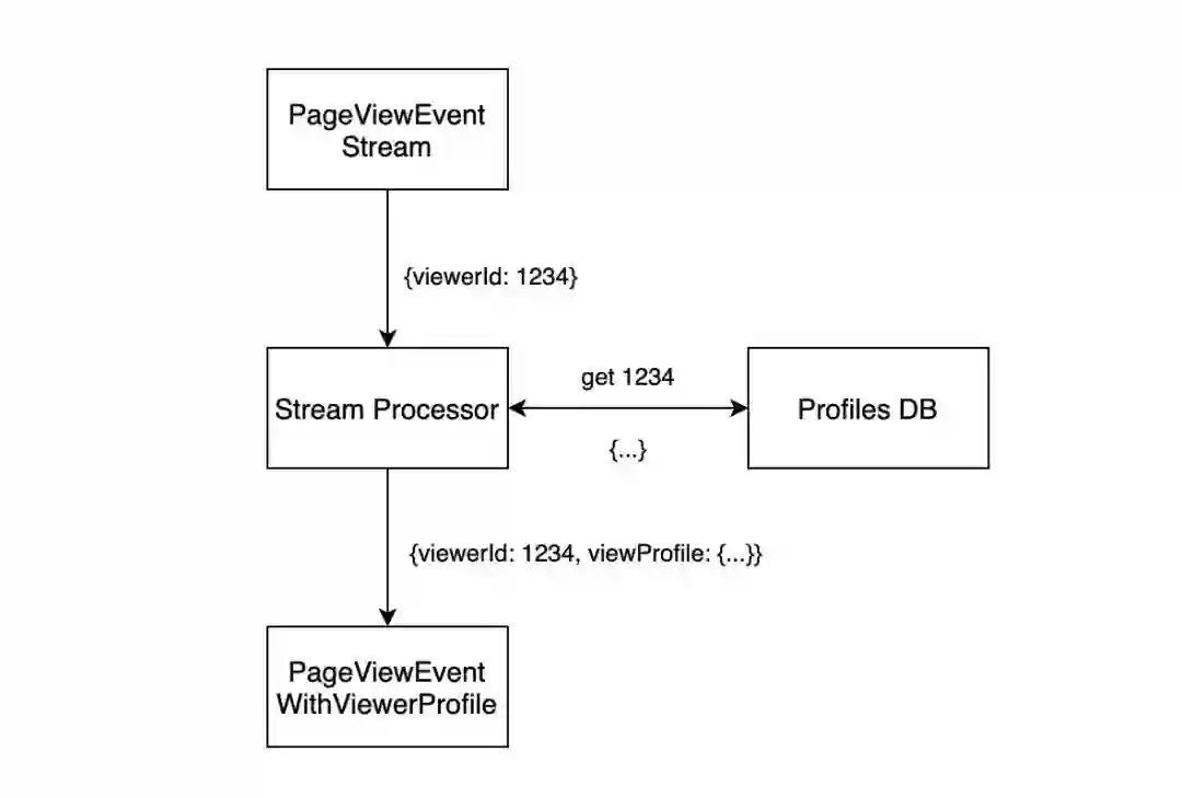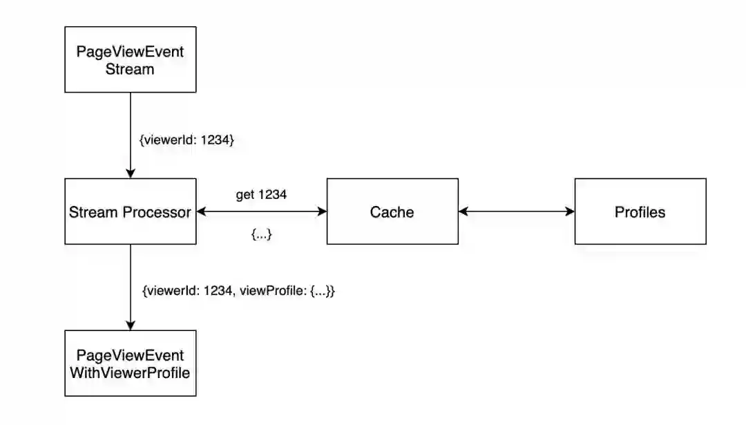 有时在流处理的过程中我们还需要 join 其它数据来获取所需信息,如果处理每条数据都需要访问数据库,将使得整个过程变得缓慢。以 LinkedIn 的一个应用场景为例,Who viewed your profile,即查看谁访问过我的个人资料: