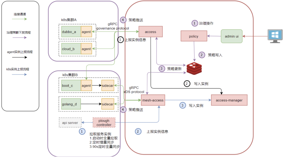 服务实例信息的 CDS、EDS,通过 controller 同步,然后交由治理面处理。治理面还负责制定路由功能和策略,各种 xDS 信息汇总后传送给 MOSN。MOSN 会带有流量染色的请求,然后将信息传递到服务集群,再做集群里面的负载均衡。