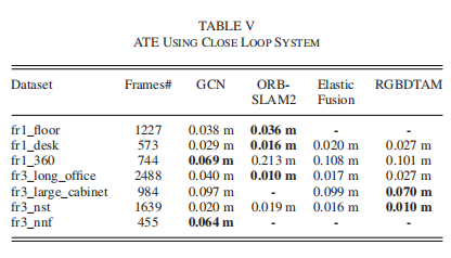 使用数据集中所有帧的ATE如表V所示,图5显示了两个原始点云重建示例。与其他方法相比,我们的方法获得了有竞争力的结果。