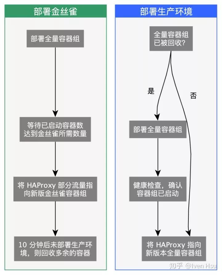 我们设计了一套新的部署逻辑,实现了蓝绿部署,即新旧版本容器组同时存在,使用 HAProxy 做流量切换: