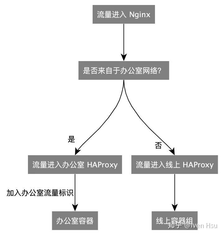 为了验证知乎主站的变更,我们决定在办公室网络,提前访问已经合并到主干分支、但还没有上线的代码。我们在 Nginx 层面做了流量拆分,当访问源是办公室网络的时候,流量流向办公室专属的 HAProxy: