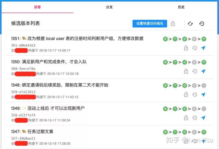如图所示是某个应用的候选版本列表,每个候选版本,用户都可以将其部署到多个部署阶段(Stage)。