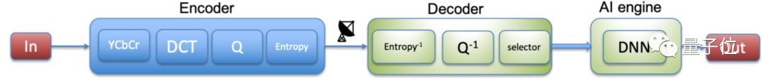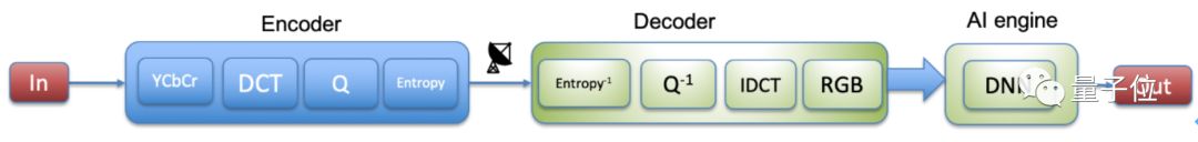 图像输入(In)通常是RGB的空间域信号,在编码端经过RGB-to-YCbCr的转化、离散余弦变换(DCT)、量化(Quantization), 以及熵编码(Entropy coding),得到压缩后用来传输的信号。