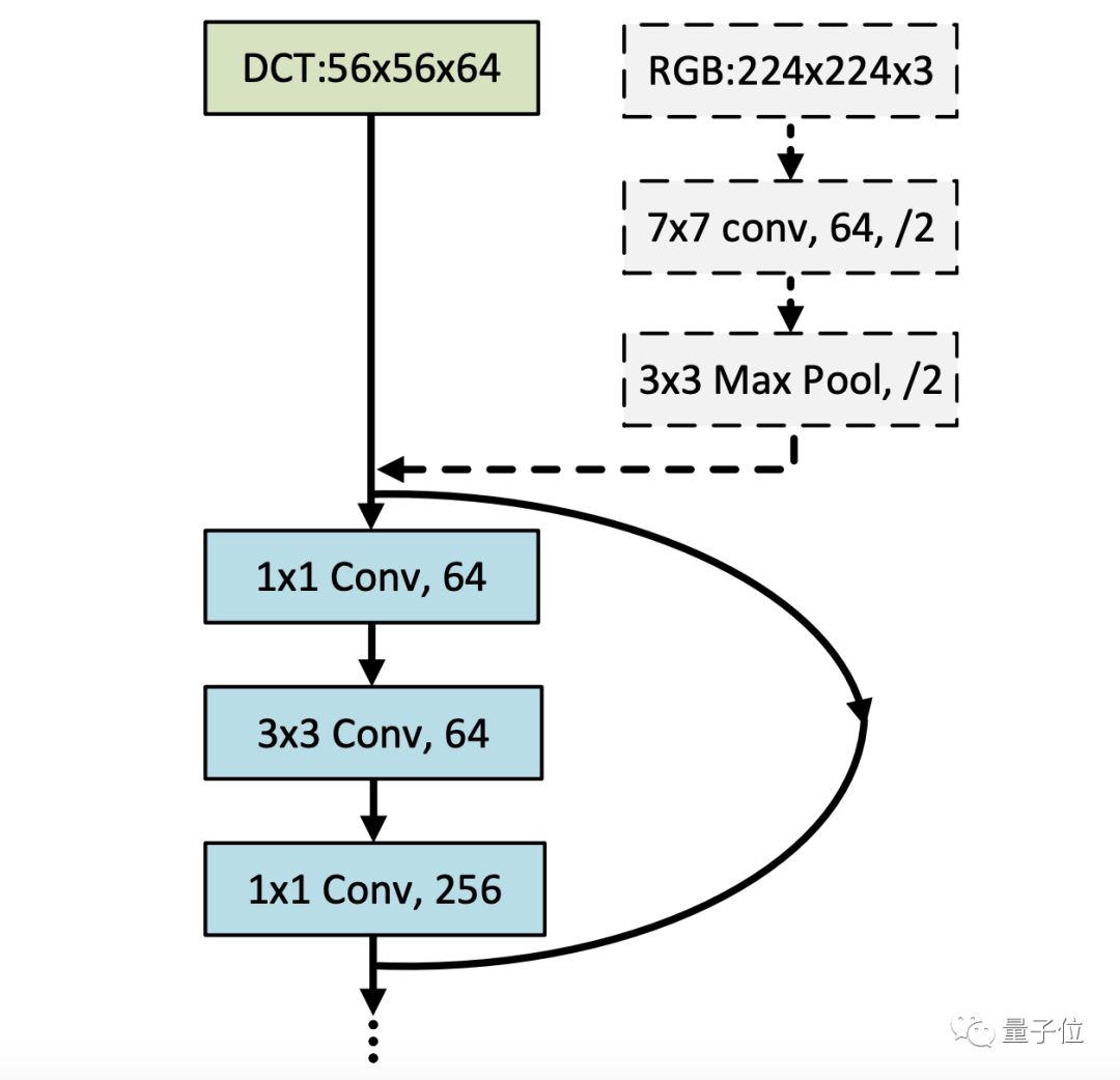 可以将192个56x56的频域特征图,全部或者部分直接接在ResNet-50的第一个残差块(Residue Block)之前,从而达到不改变ResNet-50的结构,却实现从频域做机器识别的目的,如下图所示。