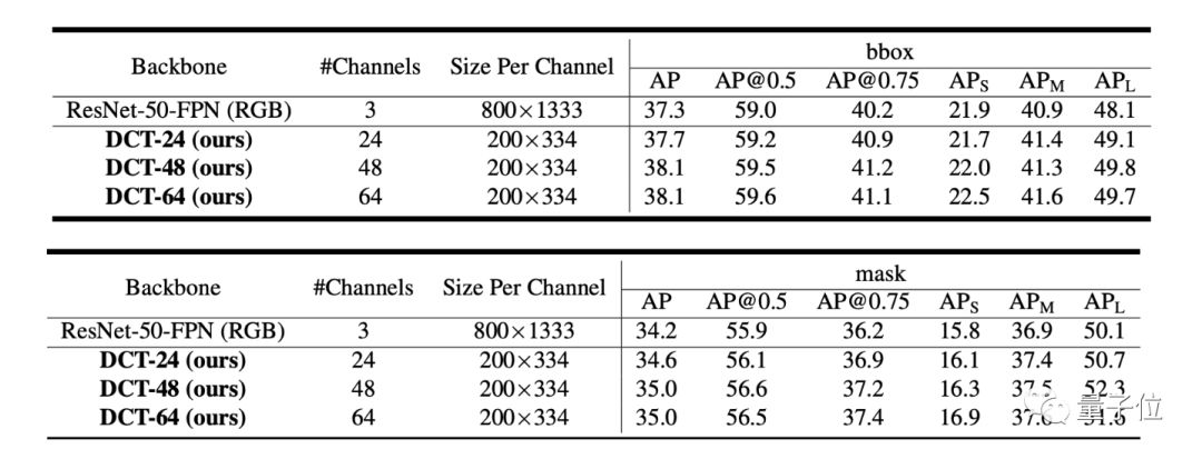 DCT-48,可以提升大约0.8%的精度(37.3%到38.1% 以及 34.2%到35.0%)。DCT-24,即输入数据大小减少一半的情况,让bbox AP 和 Mask AP的性能分别提高了0.4。