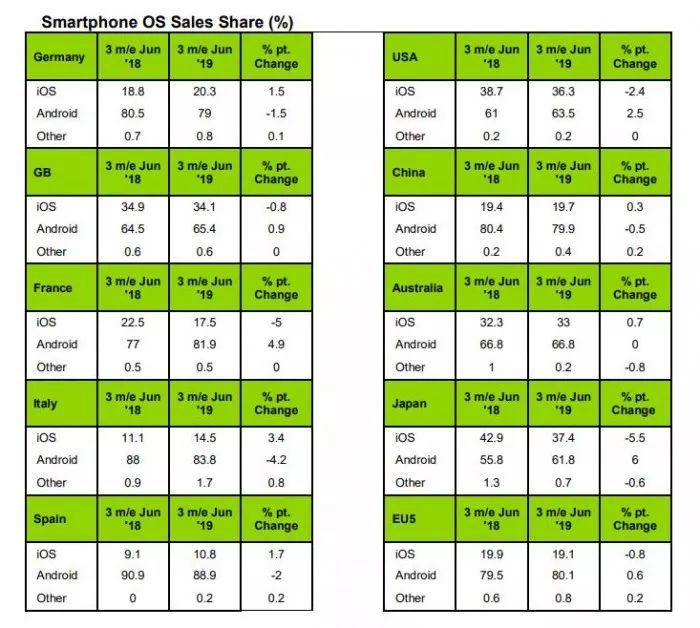 iPhone XR是美国最好卖的款式,市场占比高达7.8%,其次是iPhone 8和iPhone XS Max,三星Galaxy S10 +和Galaxy S10则紧随其后排名四五位。