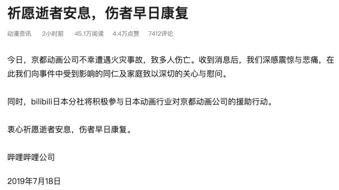 B站发布公告称,对京都动画公司不幸遭遇火灾事故深感震惊与悲痛,同时,bilibili日本分社将积极参与日本动画行业对京都动画公司的援助行动。