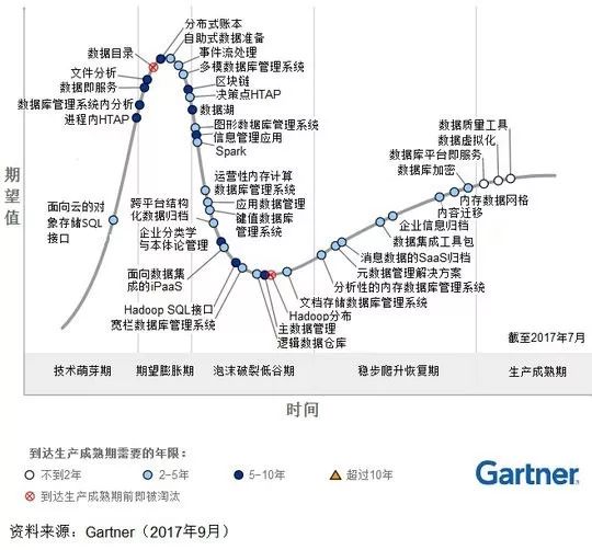 知名IT研究与顾问咨询公司Gartner发布的《2017年数据管理技术成熟度曲线》,报告用好其显眼的红色标识出Hadoop在到达“生产成熟期”之前即被淘汰。