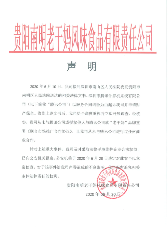 老干妈声明称,经核实,公司从未与腾讯或授权他人与腾讯就“老干妈”品牌签署《联合市场推广合作协议》,且从未与腾讯进行过任何商业合作。