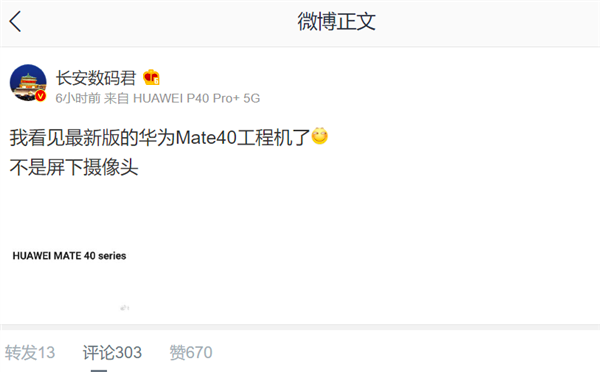 华为Mate 40工程机曝光:未采用屏下摄像头