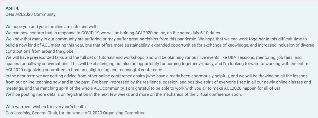值得一提的是,为了应对新冠肺炎的影响,大会主席Dan Jurafsky发信确认,ACL2020将在线举办。