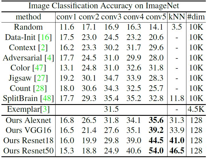 研究者在 ImageNet ILSVRC [34] 上学习特征表示,并将他们的方法与代表性的无监督学习方法进行比较。