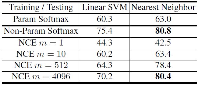 表 1:通过在学习到的特征上应用线性 SVM 或 kNN 分类器在 CIFAR10 的 Top-1 准确率。本文提出的非参数化的 softmax 优于参数化的 softmax,并且用 NCE 方法 得到的准确率随 m 单调递增。