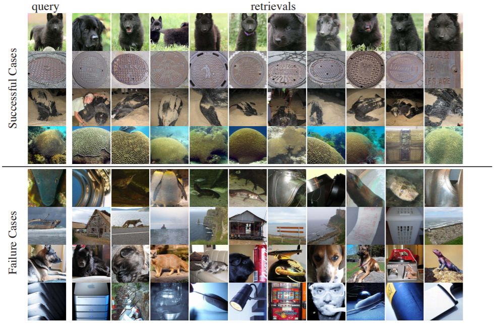 图 5:查询示例的检索结果。左列是验证集的查询,右列是训练集中检索到的 10 个最接近的实例。上半部分展示了最好的表现。下半部分展示了最差的表现。