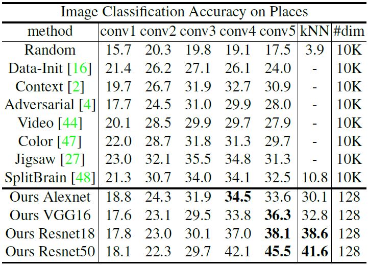 实验结果表明,在无监督领域,该方法在图像分类方面远超过最先进的方法。具体地,在 ImageNet 1K [1] 上的 top-1 准确率为 46.5%,Places 205 [41] 为 41.6%。若有更多的训练数据和更好的网络架构,该算法会持续提高测试结果。