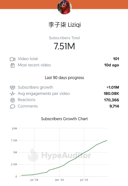 根据国际网红统计平台HypeAuditor的数据,李子柒当前粉丝750万。增长曲线方面,也是一条线性而接近指数的,典型而且非常健康的形状。