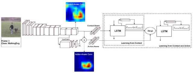 图2 我们的方法概述。我们提议提取上下文感知的特征,编码关于场景的全局信息,并将它们与关注于动作本身的动作感知特征相结合。为此,我们引入了一个多级LSTM架构,利用两种特征来预测或预报动作。需要注意的是,可视化的缘故,彩色地图是通过一个超过512通道的平均池化操作从三维张量(512×W×H)得到的。