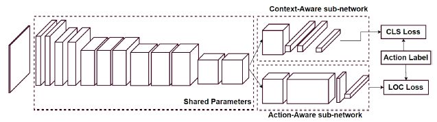 图3 我们的特征提取网络。我们特征提取的CNN模型是基于VGG-16结构进行一些修改。直到conv5-2,网络与VGG-16相同。此层的输出连接到两个子模型。第一种方法通过提供全局图像表示提取上下文感知的特征。第二个依赖于另一个网络来提取动作感知特征。