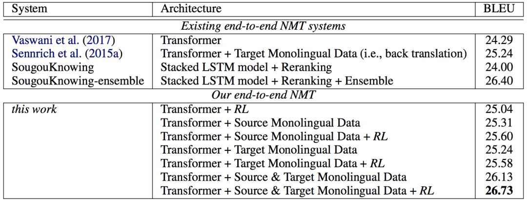 第三,研究已经表明,使用 MLE 训练时,大规模数据(尤其是单语言数据集)能为翻译质量带来显著提升 [Sennrich et al., 2015a; Xia et al., 2016]。但如何在 NMT 中将强化学习与单语言数据结合起来?这方面几乎仍是研究真空。