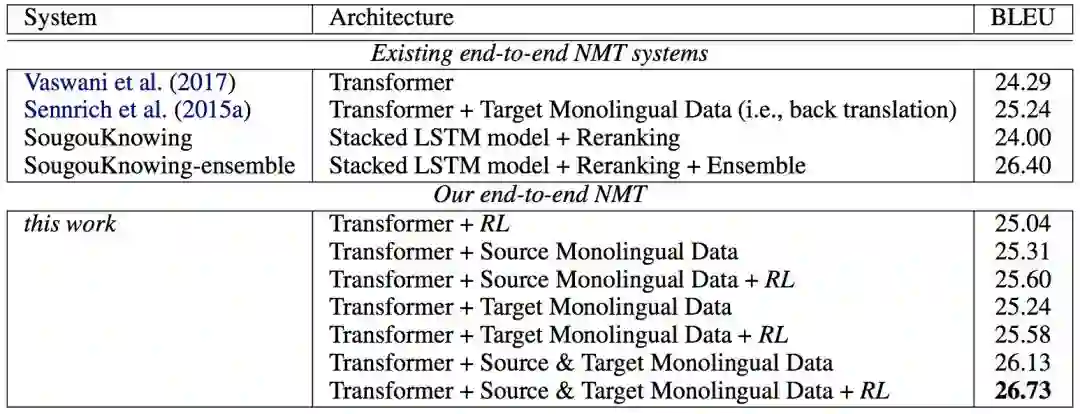最后,作为对我们的实验结果的总结,我们将几种有代表性的端到端 NMT 系统与我们的研究成果进行了比较,如表 7 所示,其中包含 Transformer [Vaswani et al., 2017] 模型,使用以及没使用反向翻译的方法 [Sennrich et al., 2015a],以及在 WMT17 汉英翻译挑战赛上表现最好的 NMT 系统(SougouKnowing-ensemble)。结果清楚地表明,在将源侧和目标侧的单语言数据与强化学习训练结合到一起之后,我们能得到当前最佳的 BLEU 分数 26.73,甚至超过了在 WMT17 汉英翻译挑战赛上最佳的集成模型。