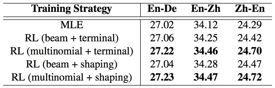 我们希望能通过这篇论文填补这些空白;我们还研究了可以如何应用强化学习来得到强大的 NMT 系统,使其能取得有竞争力的表现,甚至达到当前最佳。我们对强化学习训练的不同方面执行了几项综合研究,以便了解如何:1)设置有效的奖励;2)以不同的权重结合 MLE 和强化学习,从而实现训练过程的稳定;3)降低梯度估计的方差。