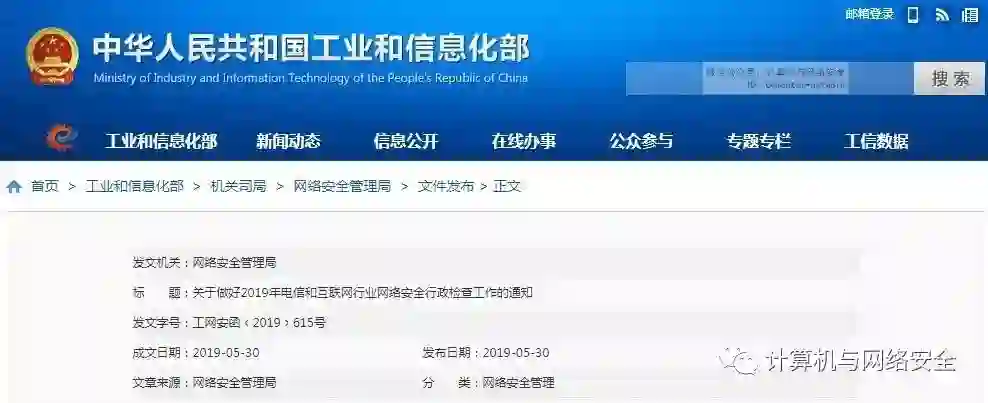为深入贯彻习近平总书记关于网络安全的系列重要讲话精神,切实做好新中国成立70周年网络安全保障工作,全面提升电信和互联网行业网络安全防护水平,根据《中华人民共和国网络安全法》《通信网络安全防护管理办法》《电信和互联网用户个人信息保护规定》等法律法规,决定组织开展2019年电信和互联网行业网络安全行政检查工作。现将有关要求通知如下: