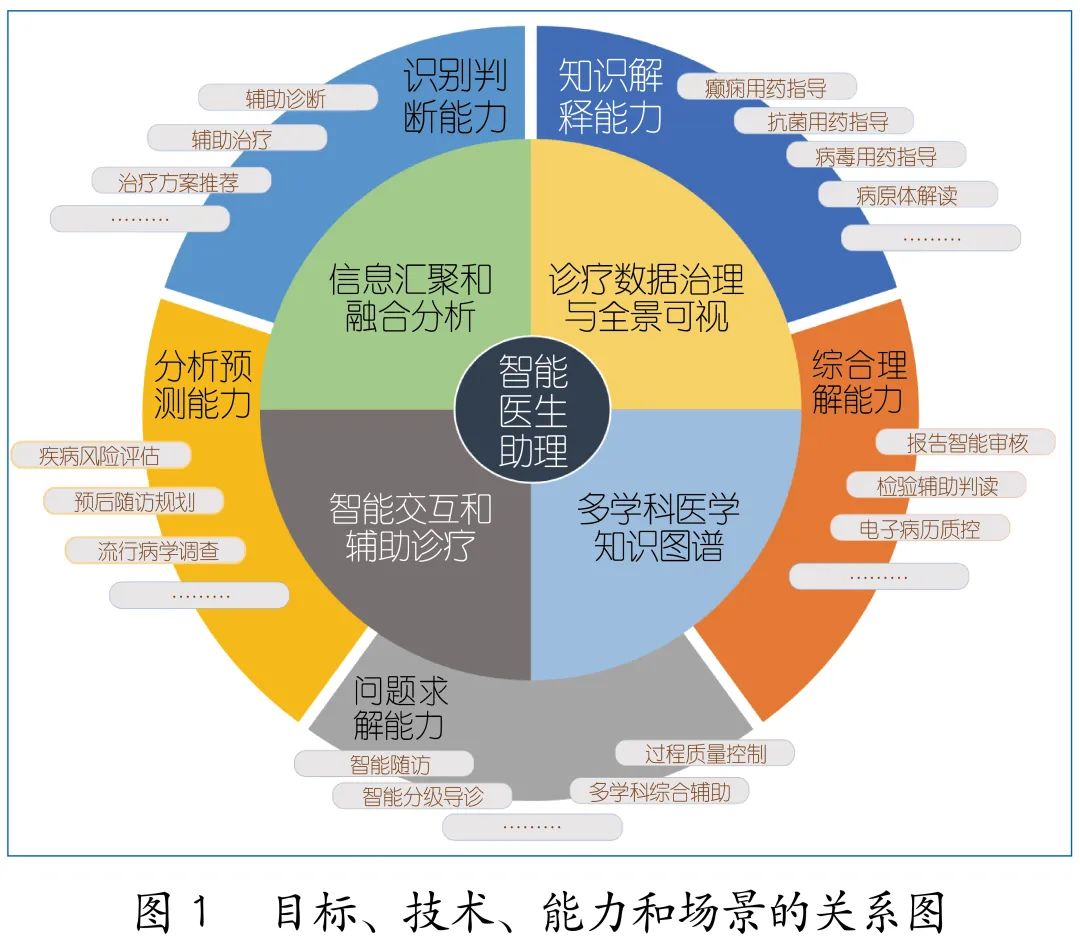 就智能医生助理而言,首先需要解决的问题是,如何利用人工智能的综合理解、分析预测、识别判断、知识解释和问题求解等能力,围绕医生诊疗过程和临床决策中的难点、痛点场景,构建诊疗辅助方法并提供支撑。智能医生助理的技术能力和应用场景的关系如图1所示。其中的主要技术难点包括:多源异构医学信息难以集成;缺少以患者为中心的诊疗过程辅助和全方位信息呈现方式;医学知识图谱各自为政、难以融合。最后,要将人工智能技术真正融合到医生日常工作中,还需要具备高交互、高性能、可扩展的平台系统支撑。