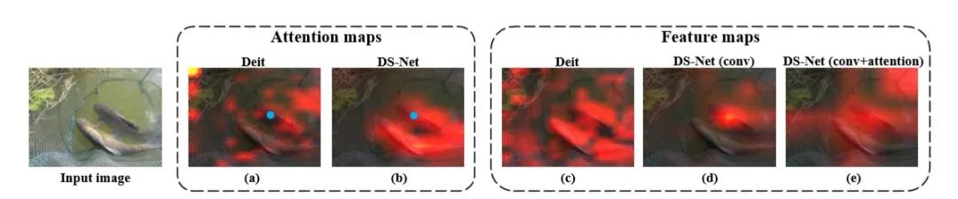 图 2 DeiT和DS-Net注意力权重图和特征图比较