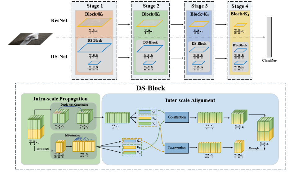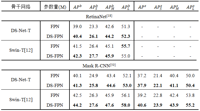 对于下游的检测和分割任务,DS-Net将双分辨率机制引入FPN,建立DS-FPN,以此引入更加丰富的局部和全局信息,实验证明DS-FPN可以有效提高检测器的性能