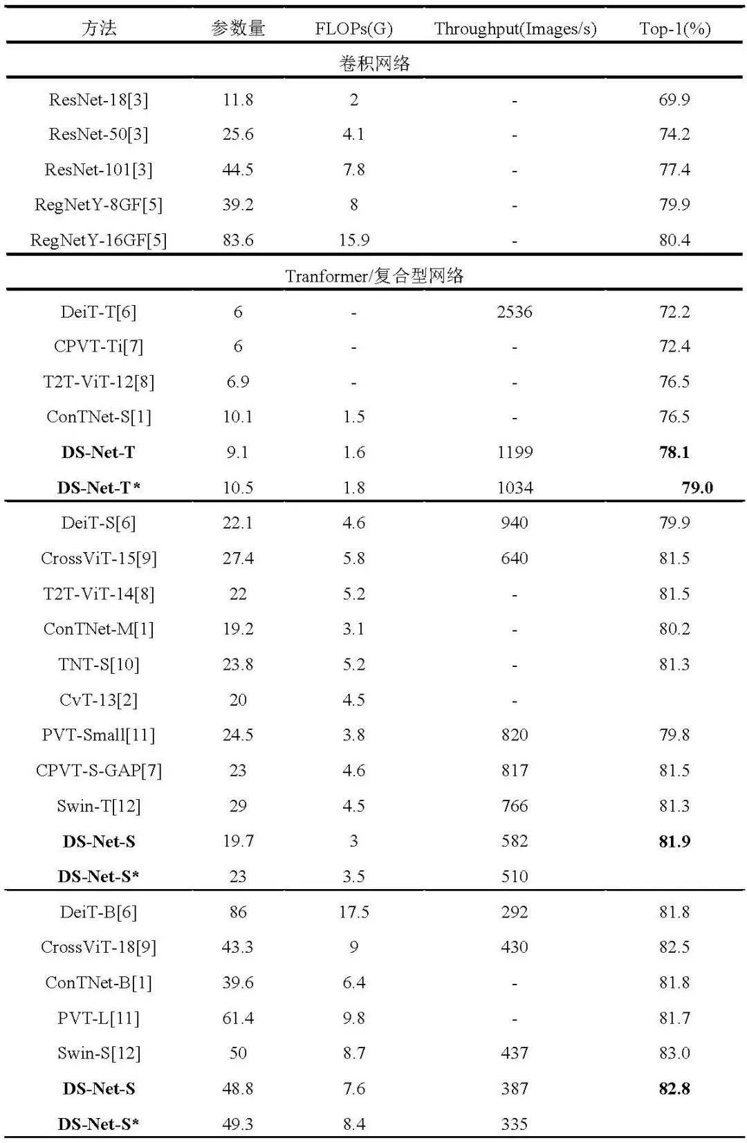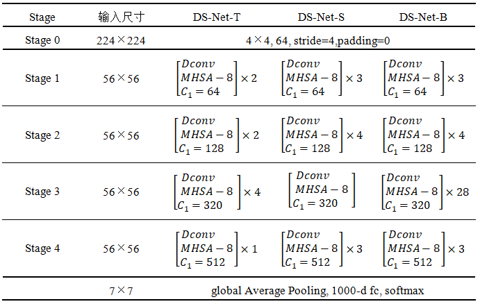 DS-Net目前提出三种大小的模型结构,即DS-Net-T、DS-Net-S和DS-Net-B: