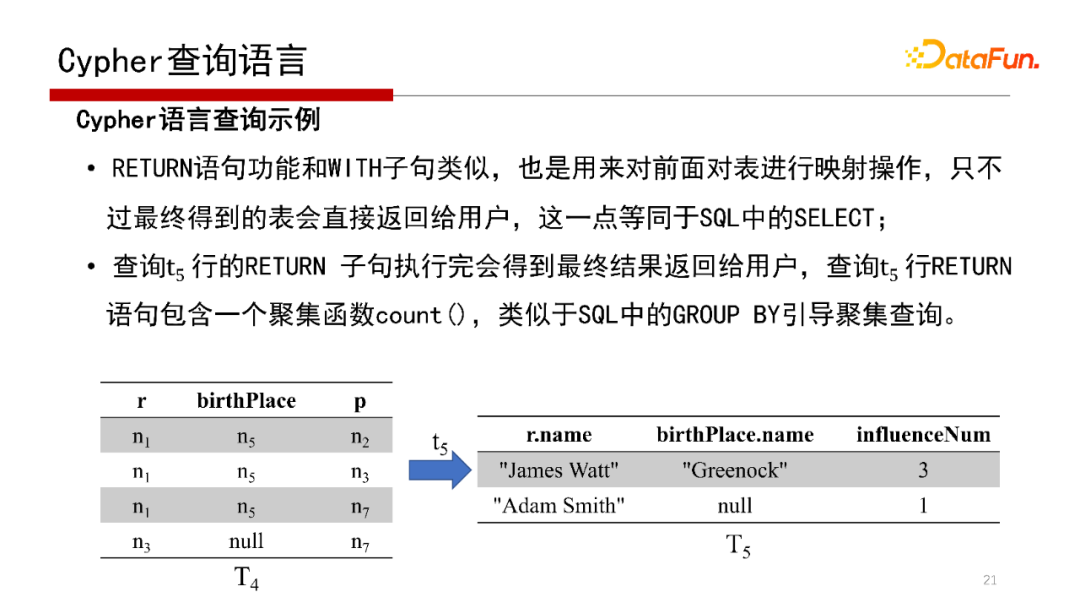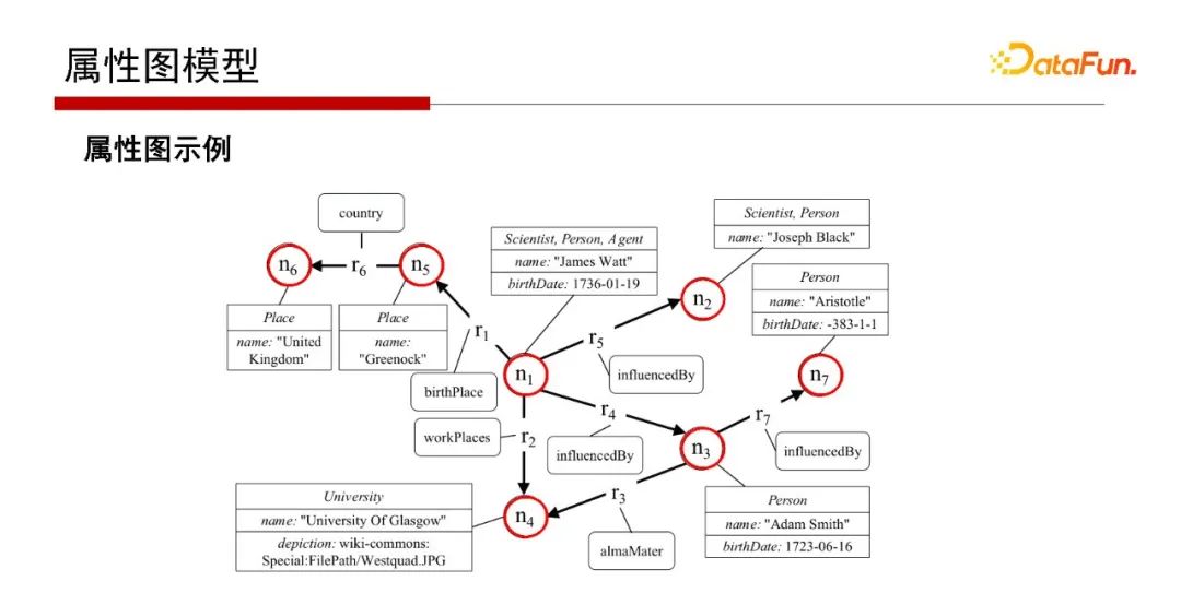 属性图如之前所讲,其点和边都是有属性表的,如Person,Person的名字name、Person的birthDate;如边r7上目前只画了标签influencedBy,但实际也可以是属性表的。这是属性图的一个非常好的优势。