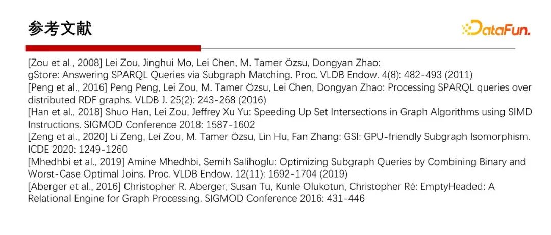 最后,总结一下:首先介绍了什么是图数据库以及我们对图数据库的一些思考;第二个重点关注查询引擎组件的工作,子图匹配和查询引擎之间的关系;第三个是对我们北京大学数据管理实验室(PKUMOD)的相关研究工作的介绍。