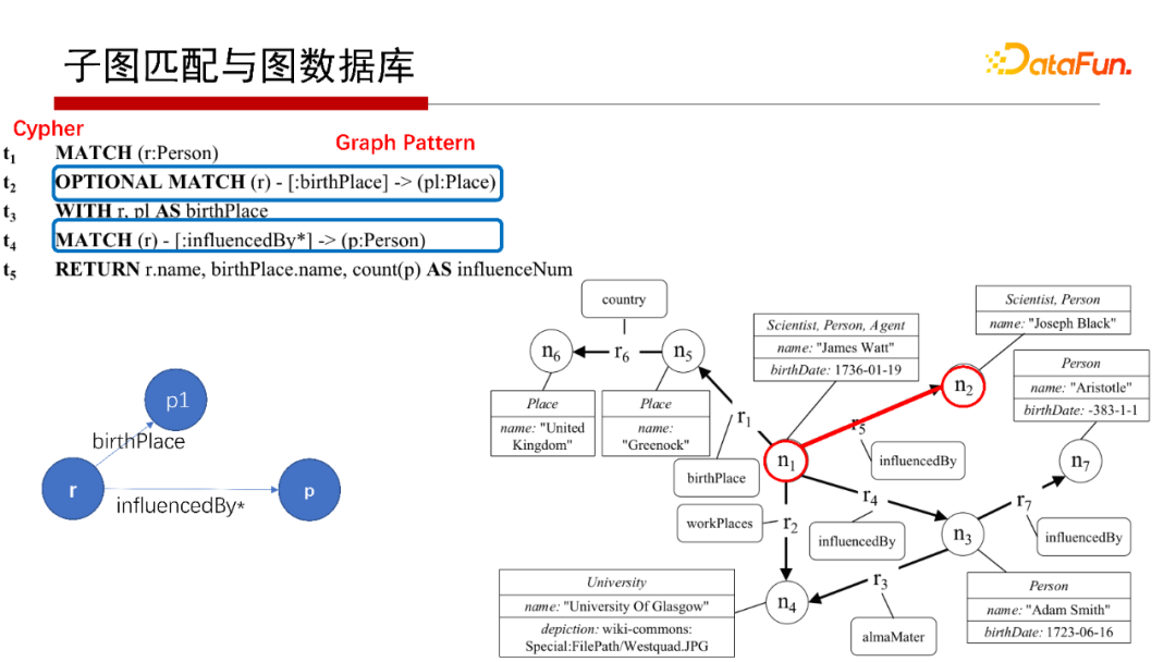 对于Cypher查询语言也是一个子图匹配。如上图中OPTIONAL MATCH和MATCH语句,其可以表现为上图中左下角的Q,在匹配右侧G时,“birthPlace”是匹配到节点的属性值上去了,仅此而已,其实也是一个子图匹配的过程。