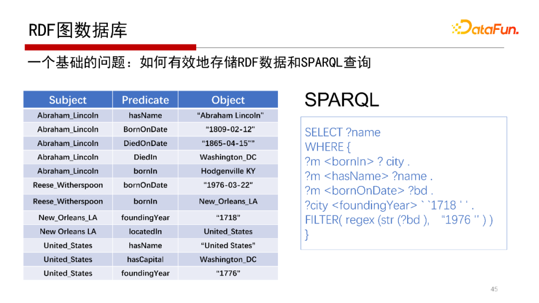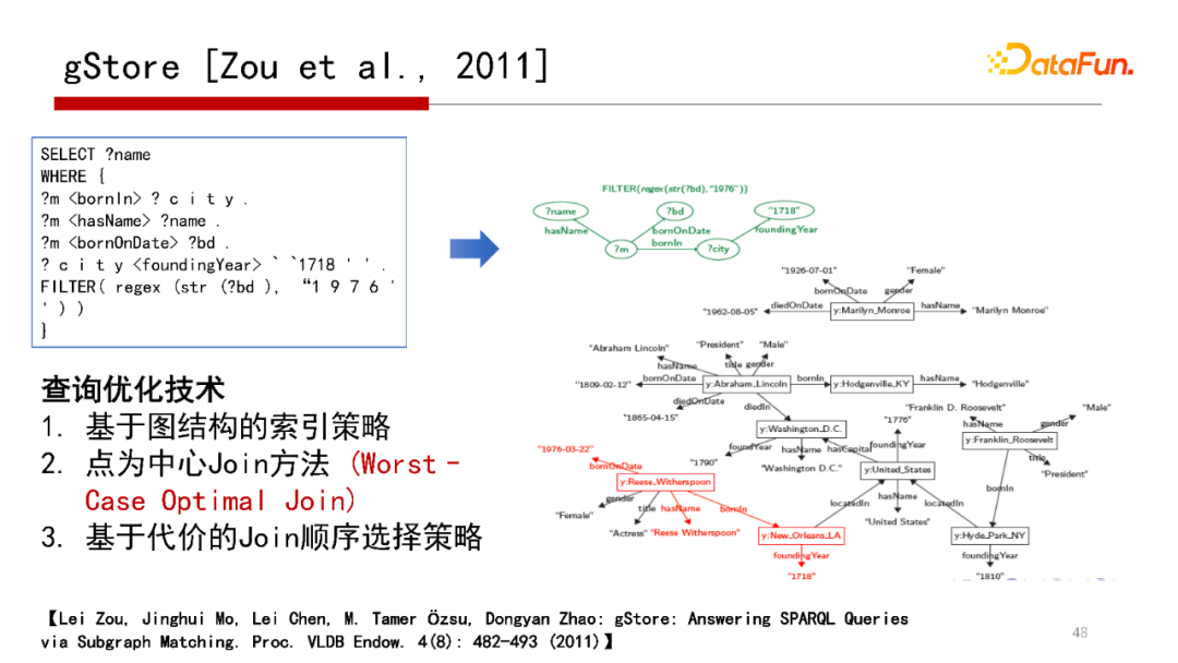 我们在2011年有一篇发在VLDB的工作“gStore: Answering SPARQL Queries via Subgraph Matching.”,给一个SPARQL,把它Match到一个查询图Q,那么回答SPARQL就是在Data Graph中找到查询图Q的匹配,如果能找到,那么就能很快回答SPARQL,这是gStore系统最核心的思路。