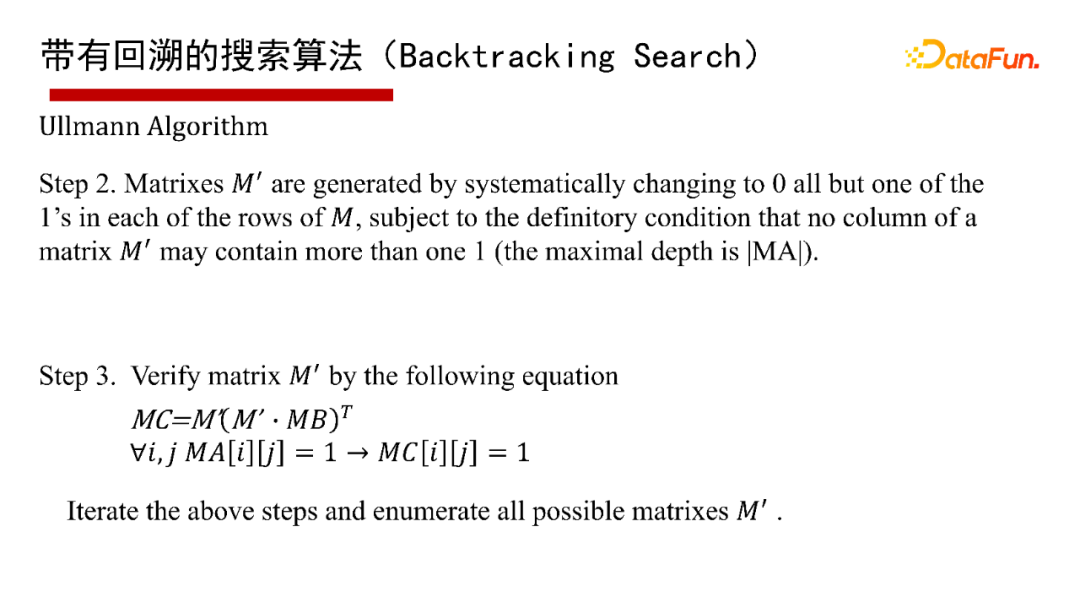 带有回溯的搜索算法(Backtracking Search),有1976年最早开始的Ullmann算法,2000年的Ullmann Algorithm算法,2004年的VF2 Algorithm算法等,这里就不再具体介绍算法本身了,有兴趣的同学们可以参考给出的参考文献。