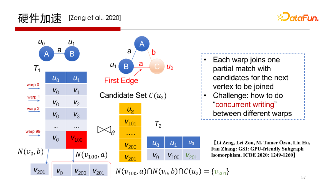 刚才提到,Worst Case Optimal Join算法,每一行是完全独立的查询操作,非常容易做并行。所以会想到使用在GPU上运行操作。但在GPU上执行操作,其每个线程或每个wrap做计算没有问题,但中间结果如何写回去,如何避免写冲突是需要考虑的。我们提出一种方案使得每一个wrap独立地去执行,并且可以独立地去写,在不需要加锁的方式下不会产生写冲突。