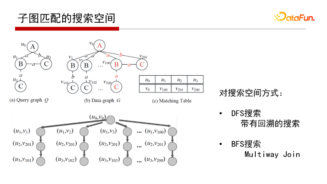 这里对子图匹配的两类算法形象化解释一下。假设有个Q和一个G,找到Q在G的子图匹配,实际就是在搜索空间查找。这里把搜索空间定义成一个搜索树(如上图左下角的属性图),Backtracking Search搜索的策略是深度优先(DFS搜索),再回溯回来;Multi-way Join搜索的策略则是宽度优先(BFS搜索),即在搜索树上一层一层去找。