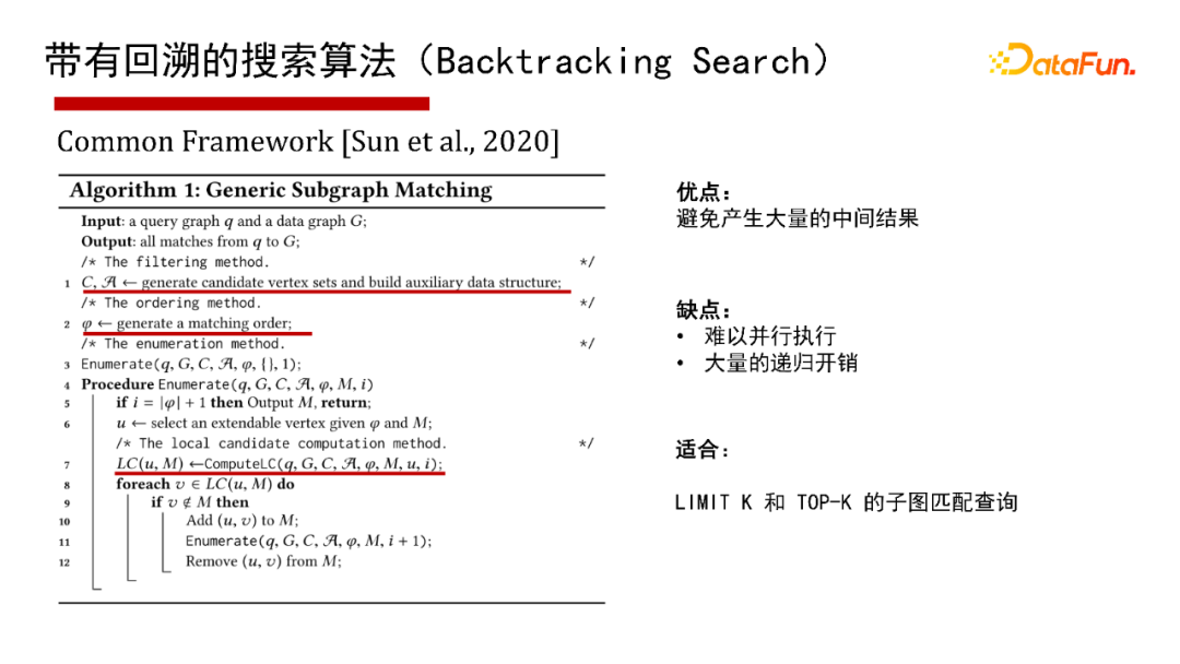 这里采用通用的算法框架(Common Framework)来讲讲带有回溯的搜索算法。给一个查询图Q,首先定义一个节点被匹配的顺序,即最先匹配哪个点,然后是哪个点(generate a matching order),然后每次试图按节点匹配顺序进行一个点一个点的匹配;如果当前状态匹配不了,则回溯;如果要找全部的解集,也得做回溯。其优点是可避免产生大量的中间结果,因采用深度优先,仅有递归调用栈的空间,没有什么中间结果。其缺点是难以并行执行,会有大量的递归开销,因此适合做LIMIT K和TOP-K的子图匹配查询,即只返回K个或TOP K个结果(K很小的情况下)。