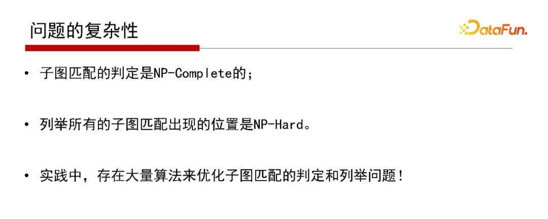 从计算复杂性来讲,子图匹配是一个非常复杂的问题。如果对查询图Q不加限制,子图匹配的判定是NP-Complete的;列举所有的子图匹配出现的位置是NP-Hard。虽然匹配算法本身是指数的,但在实践中,可以采用大量的过滤策略来检索搜索空间,从而提高查询的性能。