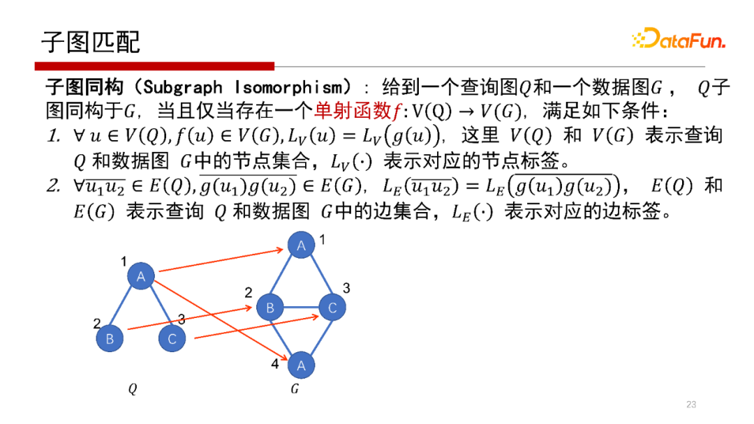 子图匹配核心概念是给到一个查询图Q和一个数据图G,Q里的每一个点通过一个单射函数映射到G当中去,即单射函数f:V(Q)→V(G)。Q中的每一个点在单射函数Function(f)作用下唯一映射到G的每个点上去,如上图中Q的1、2、3在G的中的第一个子图匹配是(1、2、3),第二个子图匹配是(2、3、4)。子图匹配的本质就是给一个Q,找到Q在G中的所有匹配,如示例中找到所有的二叉结构。