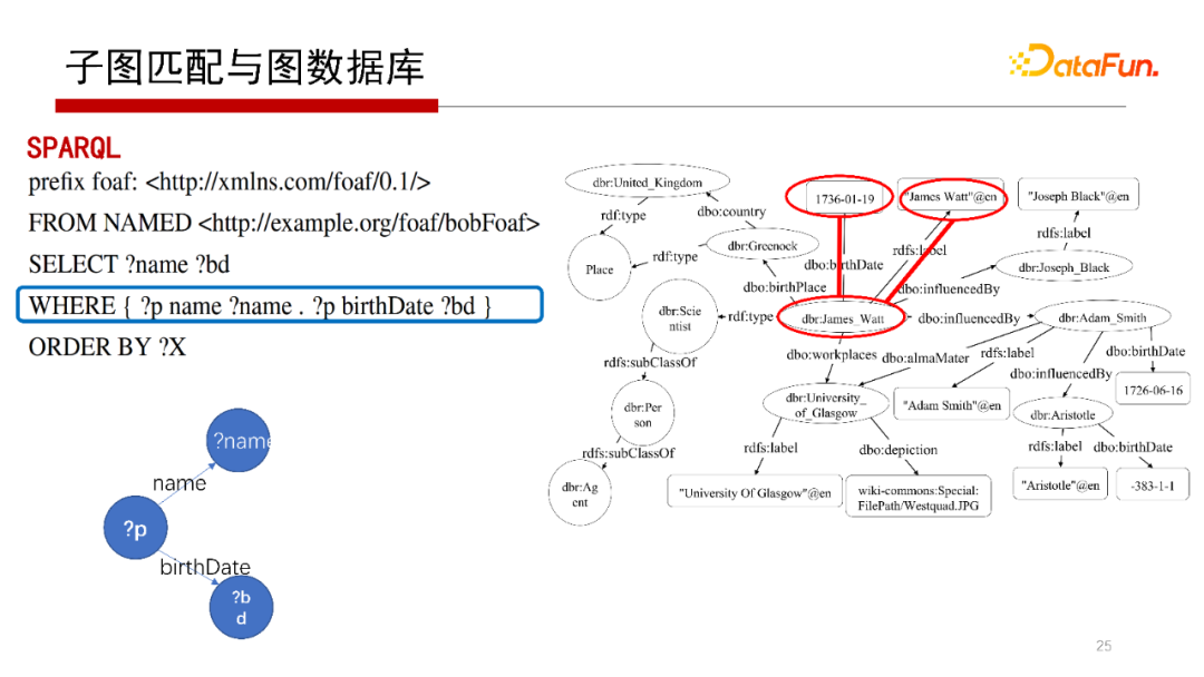 上面的SPARQL查询的WHERE子句部分,可以表达为一个查询图,如这页中的左下图。其中带有“?”的“?p”表示变量的含义。我们在这个例子中可以找到图G中的子图匹配,如红色表示的部分。执行上述SPARQL语句,本质上就是Q到G的子图匹配问题。其中,Q可能会更复杂,它不仅仅是Basic Graph Pattern(基础图模式),这个后面有机会再阐述。