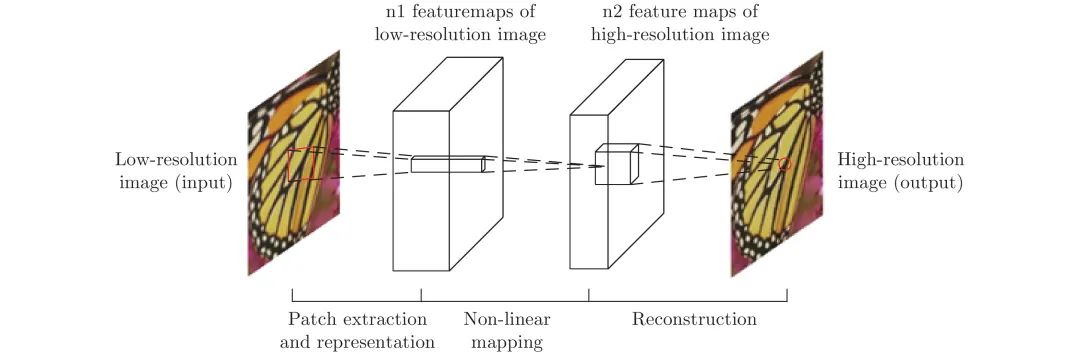 在深度学习未兴起前, 经典的单幅图像超分辨率算法占据主导地位, Lanczos重采样[1]和双三次插值[2]得到了广泛的应用, 但采用插值方法有时会导致图像边缘和细节模糊, 因此其他传统算法也被相继提出[3-5], 有效地增强了图像的质量. 经典的超分辨率重建算法需要很多先验知识, 且要求研究者具有深厚的专业知识储备. 随着深度学习的兴起, 由于该技术不需要过多的先验知识, 且重建后的图像质量优于传统算法, 因此得到了广泛的关注. Dong等[6]首先将卷积神经网络应用到图像超分辨率重建技术中, 提出了超分辨率重建卷积神经网络(Super-resolution convolutional neural network, SRCNN), 图1为SRCNN的模型框架图, 虽然只有三层神经网络, 但相比于经典超分辨率算法, 取得了显著的效果. SRCNN的出现, 吸引了国内外学者将神经网络的各种变体应用到图像超分辨率研究中, 包括卷积神经网络[7]、对抗神经网络[8]以及二者的结合[9]等.