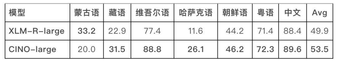 CINO基于多语言预训练模型XLM-R开发,在多种少数民族语言语料上进行了二次预训练,提供了藏语、蒙语(回鹘体)、维吾尔语、哈萨克语(阿拉伯体)、朝鲜语、壮语、粤语等少数民族语言与方言的理解能力。