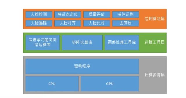 一般所谓系统构成不一定是人脸识别系统,各种AI系统大概都会如此。首先是计算资源层,在CPU或GPU上运行,在GPU上运行可能还有CUDA,CUDN等的支持。