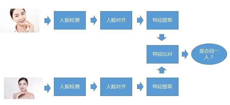 人脸识别的核心流程,所谓核心流程就是不管在什么样的人脸识别系统里面基本上都有这个流程。首先人脸检测,第二步做人脸对齐,第三步做特征提取,这是对每一张照片都要做的这三步,当要去做比对的时候就把提取的特征做比对,然后确定这两个脸是不是属于同一个人。