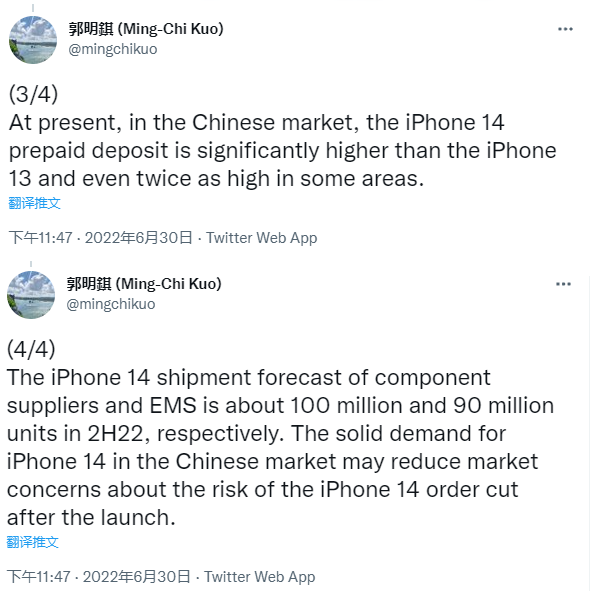 天风国际分析师郭明錤今日表示,从目前调查结果对国内经销商、零售商和黄牛的最新调查结果来看,国内的零售商/分销商/黄牛已为 iPhone 14 系列支付了有史以来最高的预付定金,甚至在某些地区足足高出一倍,从而保证供应充足。预付定金明显高于 iPhone 13 这也意味着国内对 iPhone 14的需求可能会高于预期。